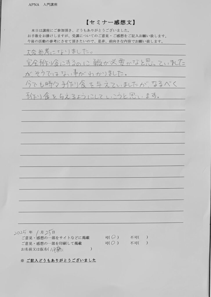 大変参考になりました。 完全手作り食にするのに勇気が必要かなと思っていましたが、そうではない事がわかりました。 今でも時々手作り食を与えていましたが、なるべく手作り食を与えるようにしていこうと思います。