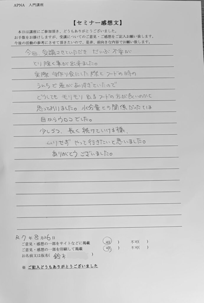 今回、受講させていただき、だいぶ不安がとり除く事が出来ました。 実際手作り色にした際とフードの時のうんちで差がありすぎていたので、どうしてもモリモリ出るフードの方が良いのかと思っておりました。水分量との関係だったとは目からウロコでした。 少しずつ、長く続けていける様、ムリせずやって行きたいと思いました。 ありがとうございました。