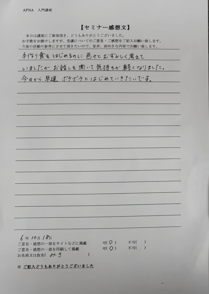 手作り食をはじめるのに色々と難しく考えていましたがお話を聞いて気持ちが軽くなりました。 今日から早速ボチボチとはじめていきたいです。