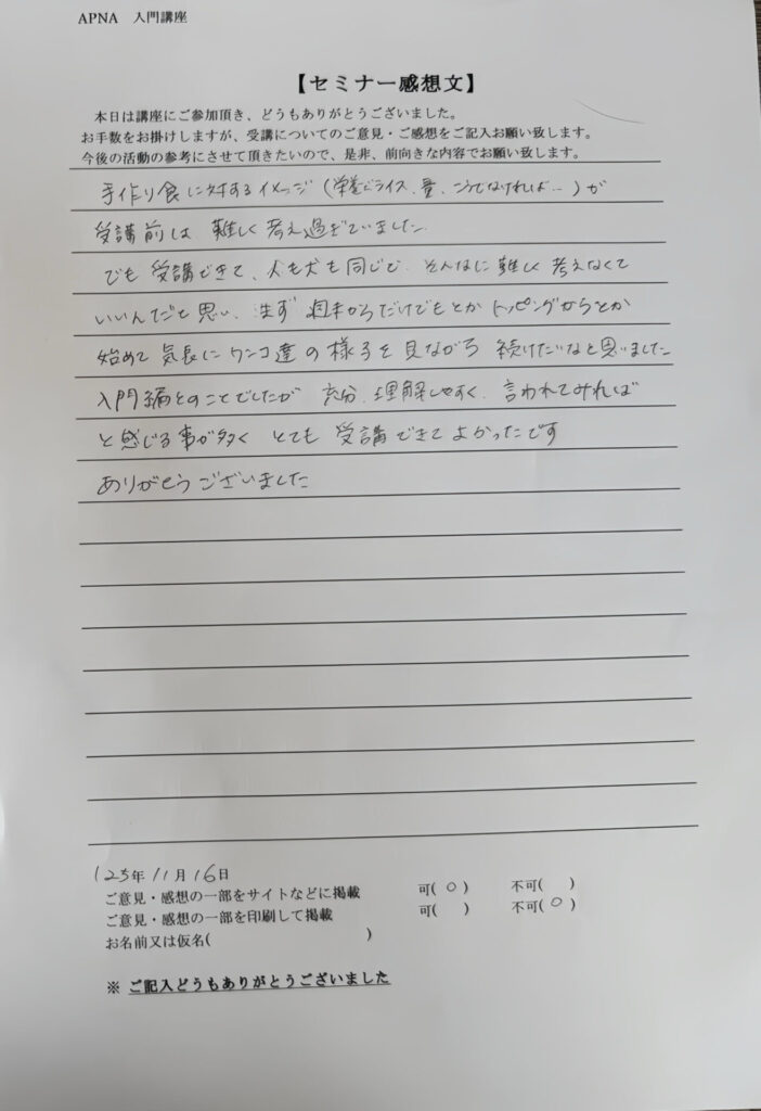 でも受講できて、人も犬も同じでそんなに難しく考えなくていいんだと思い、まず週末からだけでもとかトッピングからとか始めて気軽にワンコ達の様子を見ながら続けたいなと思いました。入門編とのことでしたが充分理解しやすく言われてみればと感じる事が多くとても受講できてよかったです。