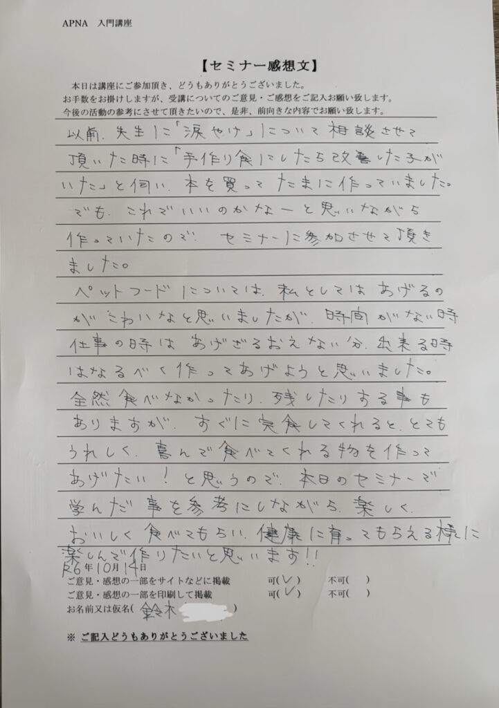 以前、先生に「涙やけ」について相談させて頂いた時に「手作り食にしたら改善した子がいた」と伺い、本を買ってたまに作っていました。でも、これでいいのかなーと思いながら作っていたので、セミナーに参加させて頂きました。